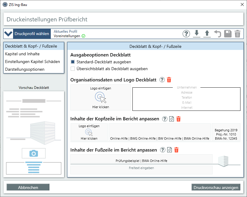 Voreinstellungen Bericht Bauwerk und Bauwerksabschnitte