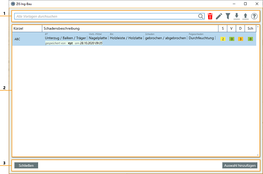 In der Vorlagenliste werden die gespeicherten Vorlagen in Tabellenform angezeigt. Außerdem erhalten Sie die Information welcher Benutzer die Vorlage gespeichert hat. Um einen Eintrag als Schaden bzw. Empfehlung in der entsprechenden Maske einzufügen tätigen Sie einen Doppelklick auf den Eintrag oder selektieren den Eintrag per Klick und betätigen im Anschluss den Button